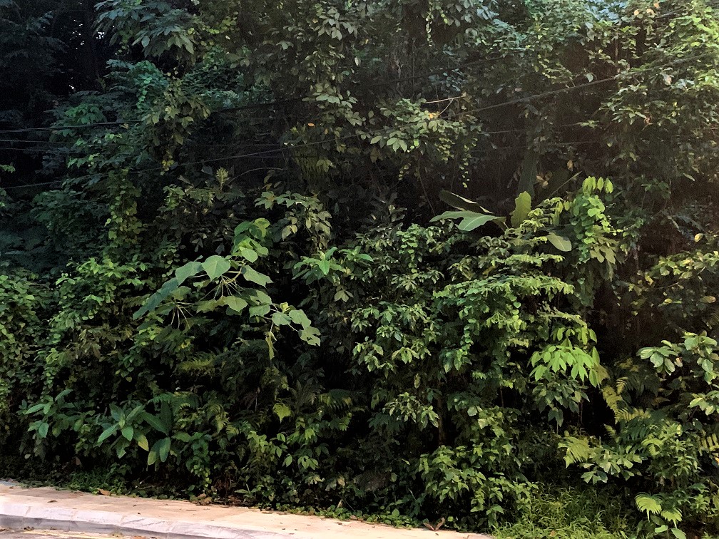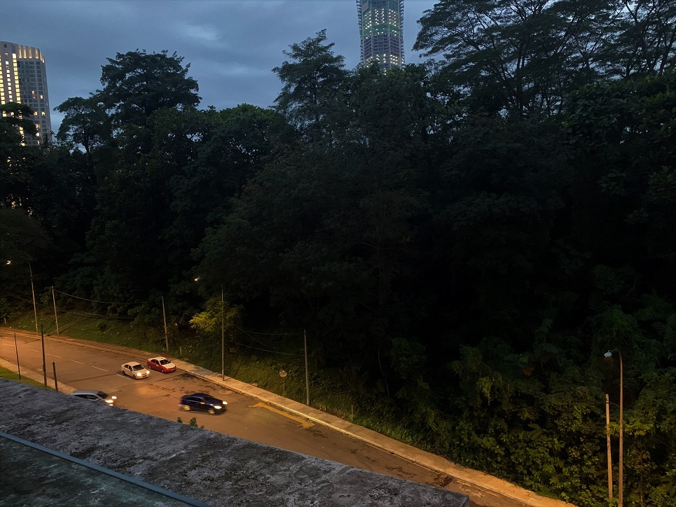 Across the street from where I sit, Streetlights have just switched themselves on due to Modern Solar technology. Red Taxi is parked almost under one. It is dusk in Kuala Lumpur at about 7.05pm. Just behind these streetlights a City Centre Remnant local Forest strip is doing its bit as a Carbon Sink sucking in Carbon gas and pumping out Oxygen as part of its established ‘bag of tricks’. It is about twenty metres wide and 150 metres long, rises steeply from the footpath to a now vacant private property that has established tree cover behind. 95% of the tree canopy is probably only 30-50 years old while one original remnant 250 years old ++ Tree stands tall above all. (left hand side of photo below). Small trees, many shrubs and ground-covers form an impenetrable understory to us humans but a perfect sanctuary for others.