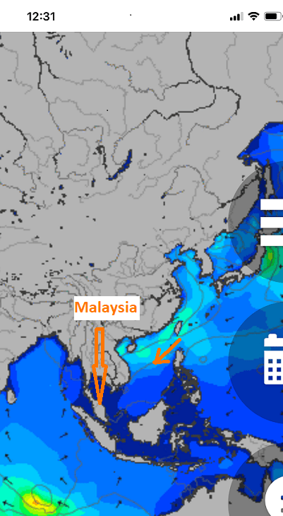 To the uninitiated, the chart below may not mean much. Brown arrow is the north east corner of the South China Sea. Philippines is immediately south of the arrow tail with Taiwan to the North. Peninsular Malaysia sitting cosy down in the south-west. If I could stop go animate, the arrow (representing wind direction) in the top right would keep on moving until it runs into the east coast of the Peninsular. As a result? SWELL! Resulting from that? SURF’s UP!