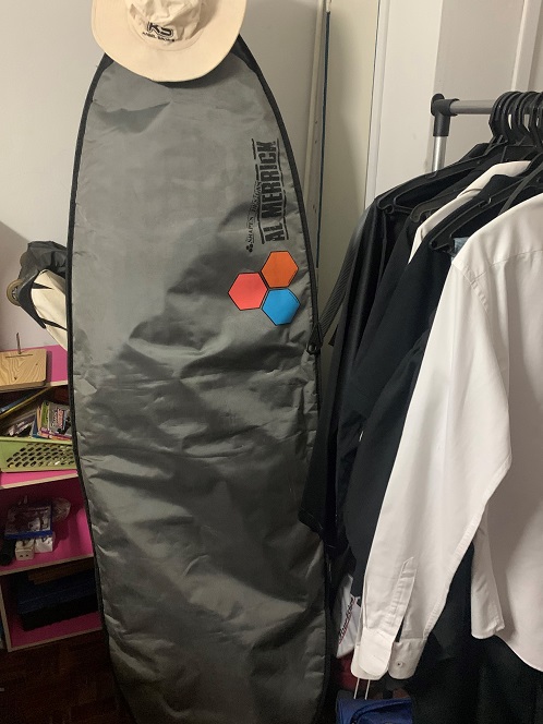 I start to move past the Board Bag and pause, “Yes my baby, you will be unzipped very soon from your seven months confining cocoon. Yes my baby, your three fins will be inserted and locked in. Your surface will be lovingly and purposefully waxed up and umbilical cord (leg rope) gleefully attached to me, body and soul. We will get wet and satiated together in Nature’s rhythmic water embrace.“