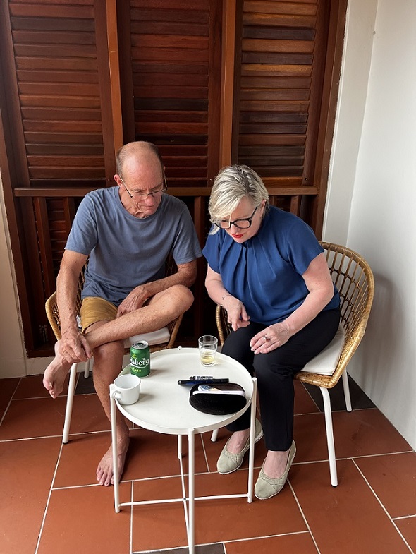 Now, together at last, two cricket addicts together for the first time in 30 plus years watching the entertaining drama with all its twists, controversies, comedy and cricket nuance. All done in front of the mobile phone nestled in Michele’s glasses case like a mini boom box. Telecast via dodgy re-streaming sites that occasionaly glitch on my phone or via VPN that still glitches on Michele’s phone. Minor inconveniences that did not deter our watching resolve.